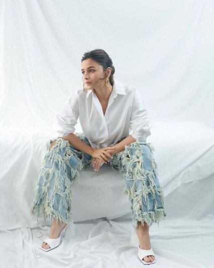 वाइट फ़ुलस्लीव फ़ॉर्मल शर्ट के साथ अलहदा-सा जींस आपको कितना अलग और आकर्षक दिखा सकता है, आलिया के इस फ़ैशन लुक में यह बात आप ख़ुद ही देख लें.