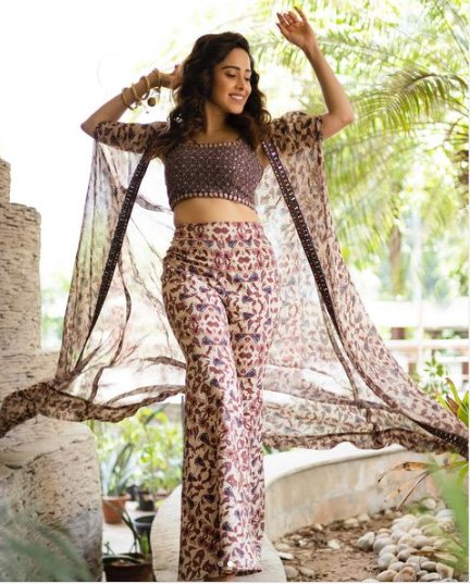 नुसरत भरूचा ने डिज़ाइनर रिधिमा भसीन के फ़ेस्टिव म्यूज़िंग टू कलेक्शन से चुना गया यह फ़्लोरल प्रिंट वाला एम्बेलिश्ड ब्रालेट और केप सेट पहना है. उनके इस लुक को सेलेब्रिटी स्टाइलिस्ट निधि जेसवानी ने स्टाइल किया है. आप ख़ुद ही देखिए कि कैसे केप इस आउटफ़िट के लुक को बेहतरीन बना रहा है. इस तरह का एकाध आउटफ़िट आपके वॉर्ड्रोब में ज़रूर होना चाहिए.