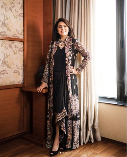 यह एम्बॉयडर्ड ब्लैक आउटफ़िट, जो नीतू कपूर ने पहना है वह डिज़ाइनर अनामिका खन्ना के कलेक्शन से है. यह आउटफ़िट भले ही फ़्यूशन हो, लेकिन इसमें पारंपरिक झलक ज़्यादा है. दरअसल, इसका केप इसे पूरी तरह से पारंपरिक लुक में बदल रहा है. नीतू के इस लुक को स्टाइल किया है सेलेब्रिटी स्टाइलिस्ट मोहित राय ने. इस तरह का लुक आप किसी ऐसे किसी भी समारोह में अपना सकती हैं, जहां की महफ़िल आप लूट लेना चाहती हों.
