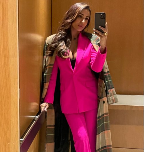 फ़ुशिया कलर का यह आकर्षक सूट जो मलाइका अरोरा ने पहन रखा है वह मंदिरा विर्क के क्लोदिंग ब्रैंड का डिज़ाइन किया हुआ है. यह रंग तो यूं भी ध्यान अपनी ओर खींच ही लेता है इसलिए इतने शोख़ रंग का सूट पहनें तो अपना मेकअप मिनिमल ही रखें.