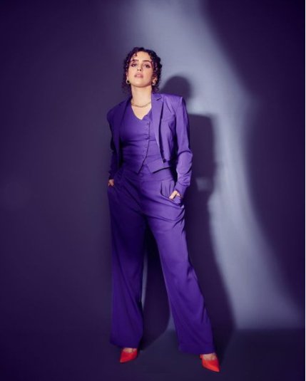 सान्या मल्होत्रा ने आंखों को सुकून देनेवाले पर्पल कलर का जो सूट पहना है, उस पर तो हमारी नज़रें अटक गई हैं. सान्या का सूट क्लोदिंग ब्रैंड लेयर्ड का है और उनके इस लुक की स्टाइलिस्ट हैं सुकृति ग्रोवर. यहां सान्या ने ब्लिंग थिंग स्टोर की फ़ैशन ज्वेलरी पहनी है.