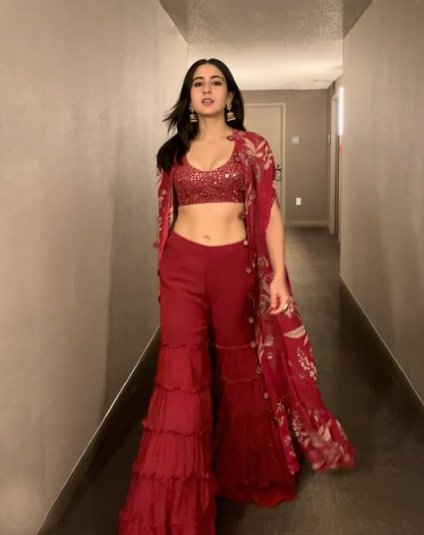 केप वाले इस शरारा सेट में सारा अली ख़ान लग रही हैं न जैसे किस ख़ास अवसर के लिए तैयार हों? अर्पिता मेहता के कलेक्शन के इस शरारा सेट को देखकर आप समझ ही गई होंगी कि केप इसे कितना सुंदर लुक देता है. सारा के इस लुक को सेलेब्रिटी फ़ैशन स्टाइलिस्ट करिश्मा शेख ने तैयार किया है.