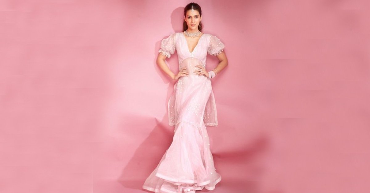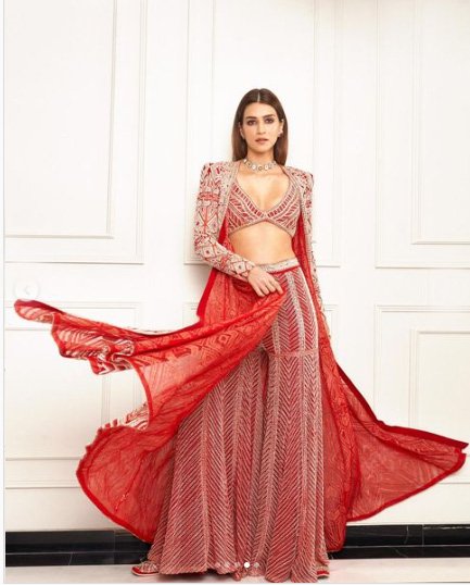 कृति का केप वाला शरारा सेट डिज़ाइनर रितिका मीरचंदानी के कलेक्शन से है. उनके इस लुक को सेलेब्रटी स्टाइलिस्ट सुकृति ग्रोवर ने स्टाइल किया है. लाल रंग अपने आप में त्यौहार जैसा महसूस कराता है और उस पर यदि इतना बारीक़ काम किया हुआ पारंपरिक परिधान ही लाल रंग का हो तो उत्सव की रौनक बढ़ जाती है.