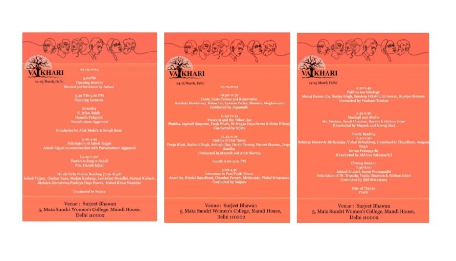 आगामी 24 मार्च और 25 मार्च को दिल्ली में ITO के नजदीक सुरजीत भवन में पहले वैखरी का आयोजन होने जा रहा है. वैखरी साहित्य, राजनीति, सिनेमा, मीडिया, जेंडर और परस्पर रुचि के ऐसे अन्य मुद्दों से जुड़े प्रख्यात व्यक्तित्वों को एक मंच पर लाने की पहल है, जिसमें व्याख्यान, पैनल डिस्कशन, सम्मान समारोह, हिन्दी-उर्दू कविता पाठ एवं क़िस्सागोई जैसे कार्यक्रम होंगे. आयोजन में वक्ताओं से मुखातिब होने के लिए “ऑथर्स कॉर्नर”, विभिन्न प्रकाशनों के स्टॉल और इस देश की संस्कृतिक विविधता को समेटे हस्तकला आदि की प्रदर्शनियां भी शामिल रहेंगी.