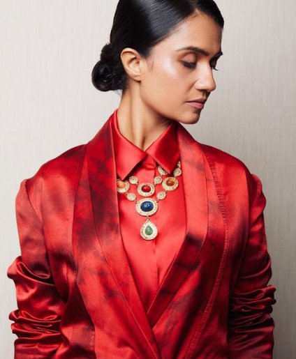 कॉलर्ड शर्ट और जैकेट के साथ इस तरह का नेकपीस पहननेवाले को उसका लुक अपने आप में भीड़ से अलग बना देता है. अमृता सुभाष का यह लुक बेहद सलीकेदार है और इसे अपनाया जा सकता है. उन्होंने श्री परामनी ज्वेल्स का नेकपीस पहना है.