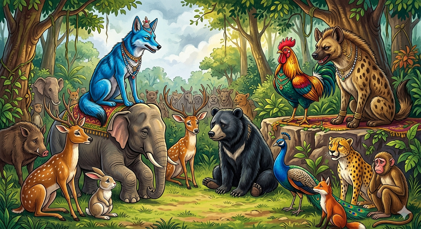 तो हुआ ये था कि एक बार एक सियार गलती से उस ड्रम में गिर गया था, जिसमें कपड़े रंगने के लिए नीला रंग तैयार किया जा रहा था. जब जानवरों ने नीले सियार को देखा तो उसे पहचान न सके और उसे परमात्मा का भेजा फ़रिश्ता समझकर बहुत सम्मान देने लगे. सियार ने इसका फ़ायदा उठाया और इशारों से उनकी गलतफ़हमी को इतना बढ़ा-चढ़ा दिया कि चढ़ावे और सम्मान से उसके वारे-न्यारे होने लगे. पर एक दिन वो गलती से बोल दिया और जानवरों को उसकी बोली से उसकी सच्चाई पता चल गई. मुर्गे बाबा द्वारा ये ख़बर पूरे जंगल तक पहुंची और सबने मिलकर उसे जंगल से बाहर भगा दिया.