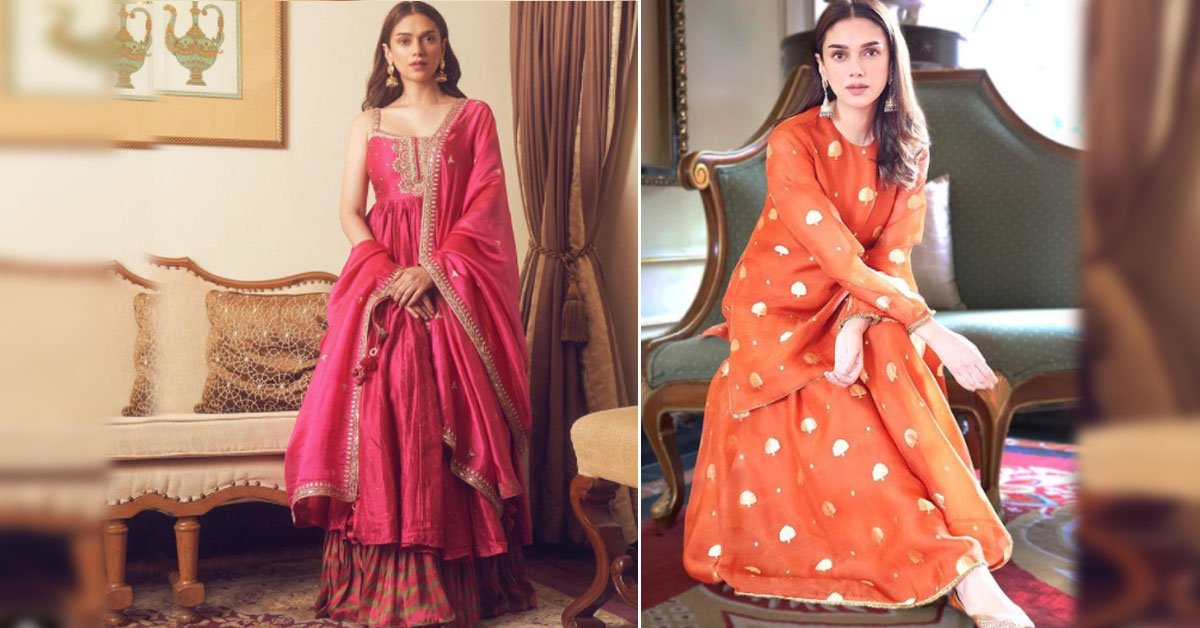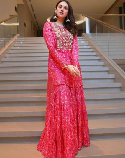 अदिति राव हैदरी ने लेबल अनुश्री का ऑलओवर वर्क वाला यह शरारा सूट पहना है, जो फ़ेस्टिव सीज़न के लिए पूरी तरह उपयुक्त है. लाल रंग का यह शेड अधिकतर लोगों पर अच्छा लगेगा, इस बात पर ग़ौर करना मत भूलिएगा.
