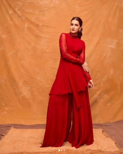 कृति सैनन ने महिमा महाजन का डिज़ाइन किया हुआ जॉर्जेट एसिमिट्रिक पेप्लम कुर्ता और पलाज़ो पैंट पहना है. अब आप ही देखिए कि यह लाल रंग कृति पर कितना जंच रहा है. आपकी रंगत कृति जैसी है तो आप बेहिचक लाल रंग के इस शेड का चुनाव कर सकती हैं.
