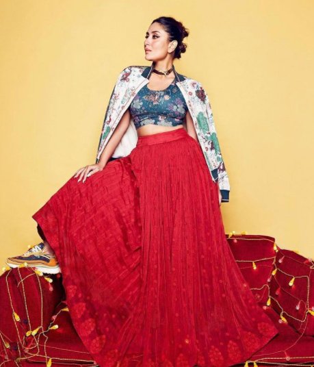 करीना कपूर ख़ान ने प्यूमा इंडिया के लिए यह स्टेटमेंट नवरस लहंगा पहना है, जो लेबल अनुश्री का है. यदि आप इस फ़ेस्टिव सीज़न इंडो-वेस्टर्न पहनना चाहती हैं तो यह भी लाल रंग को अपने लुक में शामिल करने का एक अनूठा तरीक़ा है.