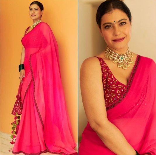 साड़ियां तो सदाबहार होती हैं और लाल रंग की सादी साड़ी को हैवी वर्क वाले ब्लाउज़ के साथ पहना जाए तो यह अपने आप में एक स्टेटमेंट लुक होता है. काजोल ने पुनीत बालना की साड़ी पहनी है. आप इस लुक को रीक्रिएट कर सकती हैं.
