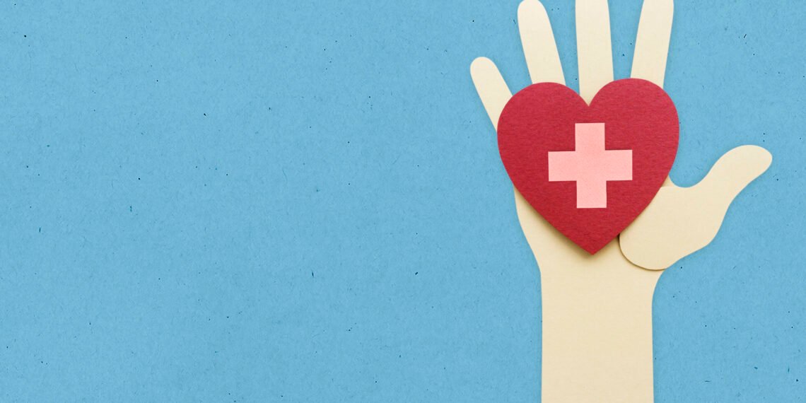 Paper craft hand with a heart supporting donation during coronavirus pandemic background